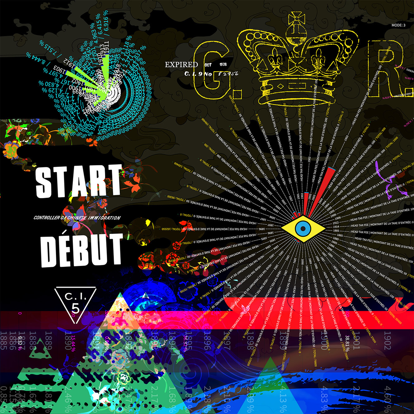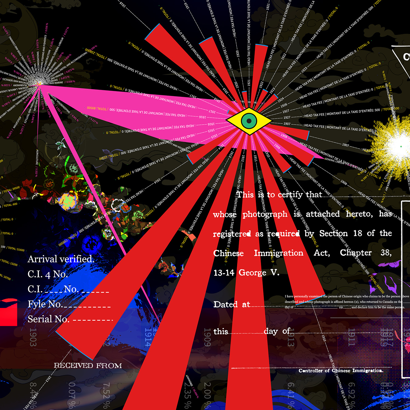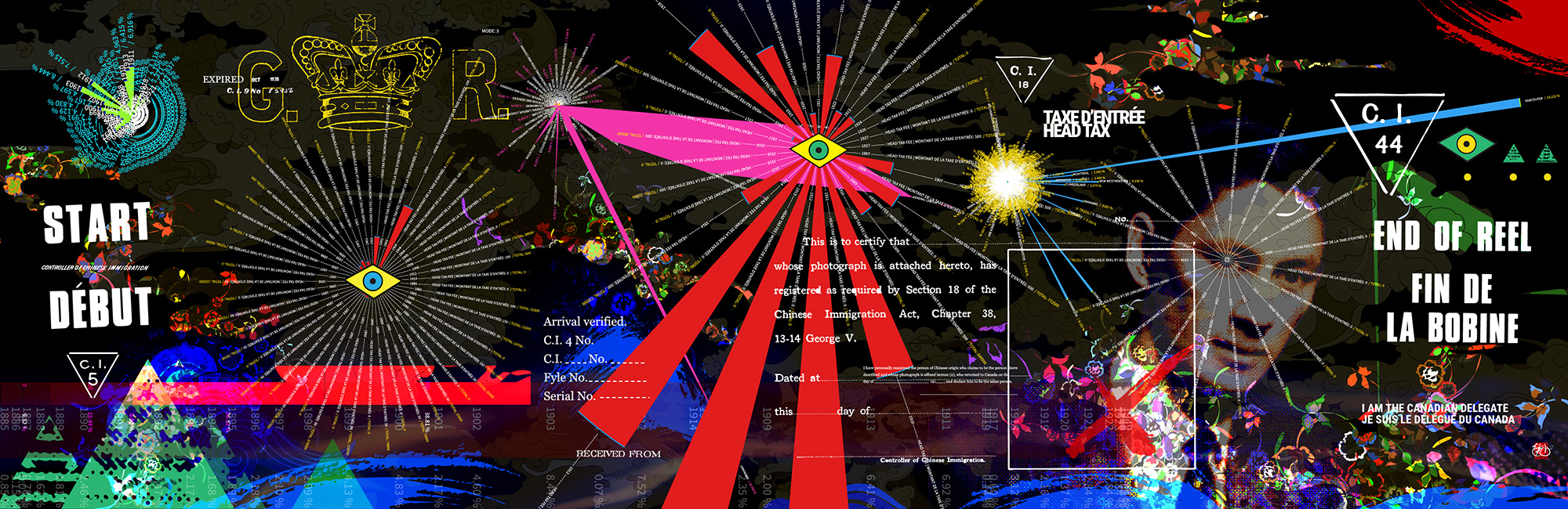 Looking Within the Shadows: Repeal and Beyond, a mural, created during my Creator in Residence role at Library and Archives Canada, is informed by archival research and conversations with the Chinese Canadian community. Drawing on records of Chinese immigration to Canada (1886–1949), these records reveal a dark chapter defined by the Chinese Head Tax, relentless registration through C.I. certificates, family separations, and the Chinese Exclusion Act of 1923, repealed after World War II.