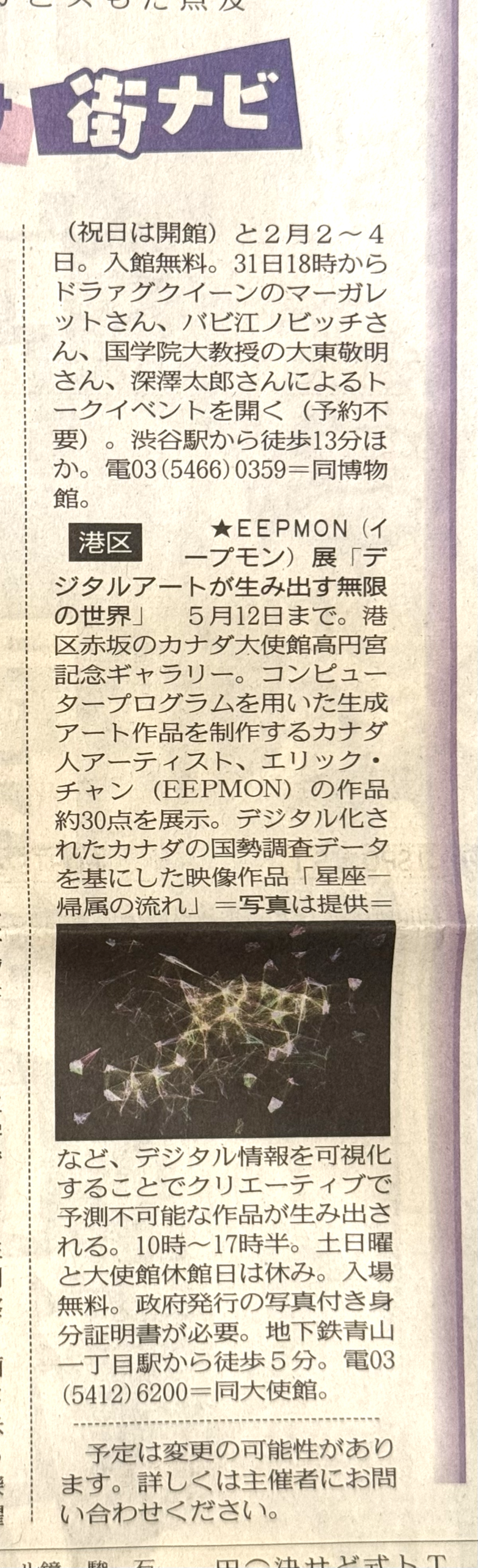 I am featured in the 東京新聞 (Tokyo Shimbun) January 23rd, 2026 newsprint in regards to my Digital World’s exhibition at the Prince Takamado Gallery, Embassy of Canada to Japan. Tokyo Shimbun is a Japanese newspaper published by The Chunichi Shimbun Company. As of 2021, it has a daily circulation of 407,777 (morning edition) and 133,708 (evening edition).